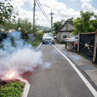 男方納聘車隊到女方家前約一百公尺處時「鳴炮」,女方也以「鳴炮」回應。